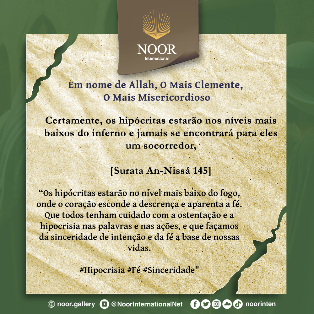 os hipócritas estarão no nível mais baixo do fogo, onde o coração esconde a descrença e aparenta a fé. Que todos tenham cuidado com a ostentação e a hipocrisia nas palavras e nas ações, e que façamos da sinceridade de intenção e da fé a base das nossas vidas.