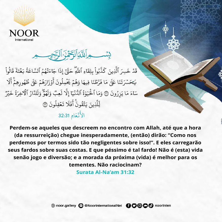 Perdem-se aqueles que descreem no encontro com Allah, até que a hora (da ressurreição) chegue inesperadamente, (então) dirão: “Como nos perdemos por termos sido tão negligentes sobre isso!”. E eles carregarão seus fardos sobre suas costas. E que péssimo é tal fardo!