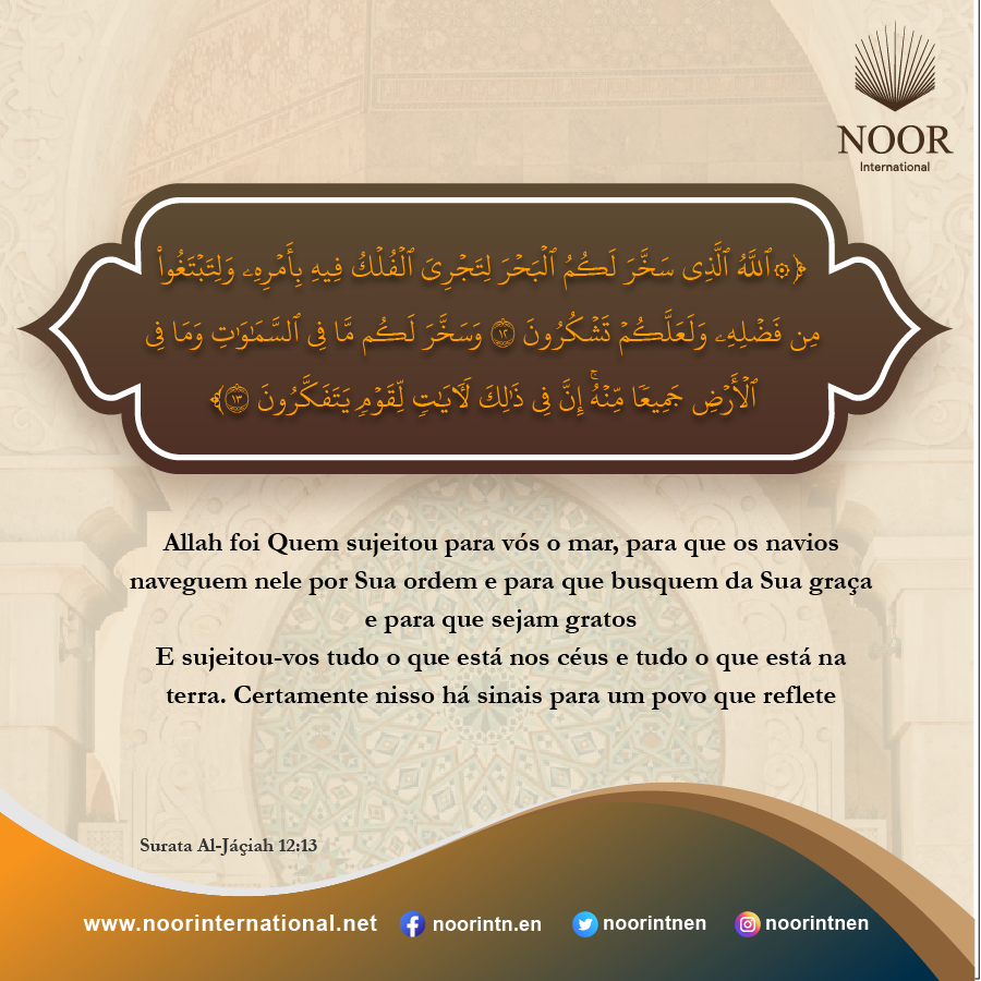 Allah foi Quem sujeitou para vós o mar, para que os navios naveguem nele por Sua ordem e para que busquem da Sua graça e para que sejam gratos