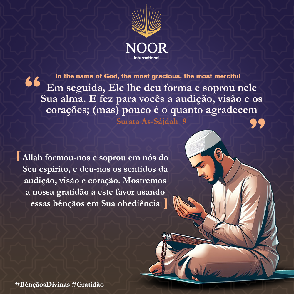 "Allah nos formou e soprou em nós de Seu espírito, e nos deu os sentidos da audição, visão e coração. Mostremos nossa gratidão a este favor usando essas bênçãos em Sua obediência." #BênçãosDivinas #Gratidão