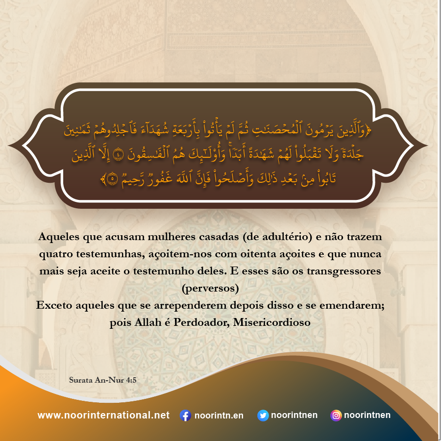 Aqueles que acusam mulheres casadas (de adultério) e não trazem quatro testemunhas, açoitem-nos com oitenta açoites e que nunca mais seja aceite o testemunho deles. E esses são os transgressores (perversos)