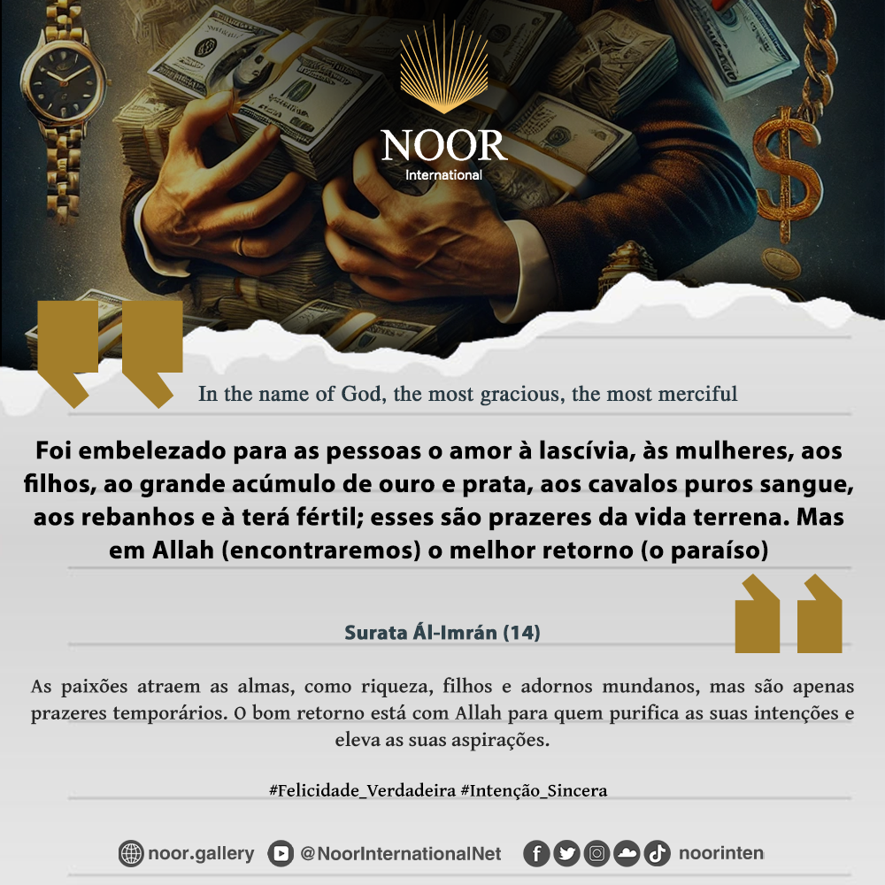 "As paixões atraem as almas, como riqueza, filhos e adornos mundanos, mas são apenas prazeres temporários. O bom retorno está com Allah para quem purifica suas intenções e eleva suas aspirações." #Felicidade_Verdadeira #Intenção_Sincera