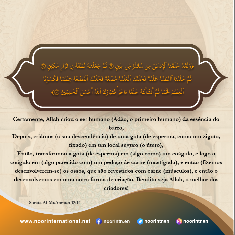Então, transformou a gota (de esperma) em (algo como) um coágulo, e logo o coágulo em (algo parecido com) um pedaço de carne (mastigada), e então (fizemos desenvolverem-se) os ossos, que são revestidos com carne (músculos), e então o desenvolvemos em uma outra forma de criação. Bendito seja Allah, o melhor dos criadores!
