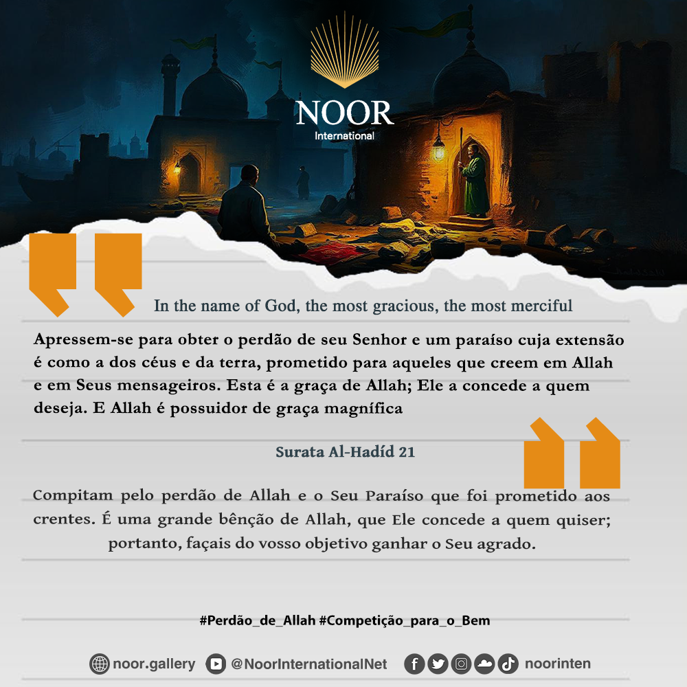 "Compitam pelo perdão de Allah e o Seu Paraíso que foi prometido aos crentes. É uma grande bênção de Allah, que Ele concede a quem quiser; portanto, façais do vosso objetivo ganhar o Seu agrado." #Perdão_de_Allah #Competição_para_o_Bem