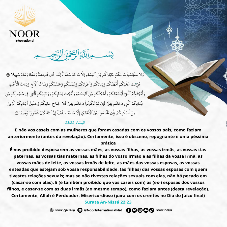 É-vos proibido desposarem as vossas mães , as vossas filhas , as vossas irmãs, as vossas tias paternas, as vossas tias maternas, as filhas do vosso irmão e as filhas da vossa irmã, as vossas mães de leite, as vossas irmãs de leite, as mães das vossas esposas, as vossas enteadas que estejam sob vossa responsabilidade, (as filhas) das vossas esposas com quem tivestes relações sexuais; mas se não tivestes relações sexuais com elas, não há pecado em (casar-se com elas). E (é também proibido que vos caseis com) as (ex-) esposas dos vossos filhos, e casar-se com as duas irmãs (ao mesmo tempo), como faziam antes (desta revelação). Certamente, Allah é Perdoador, Misericordioso (para com os crentes no Dia do Juízo final)