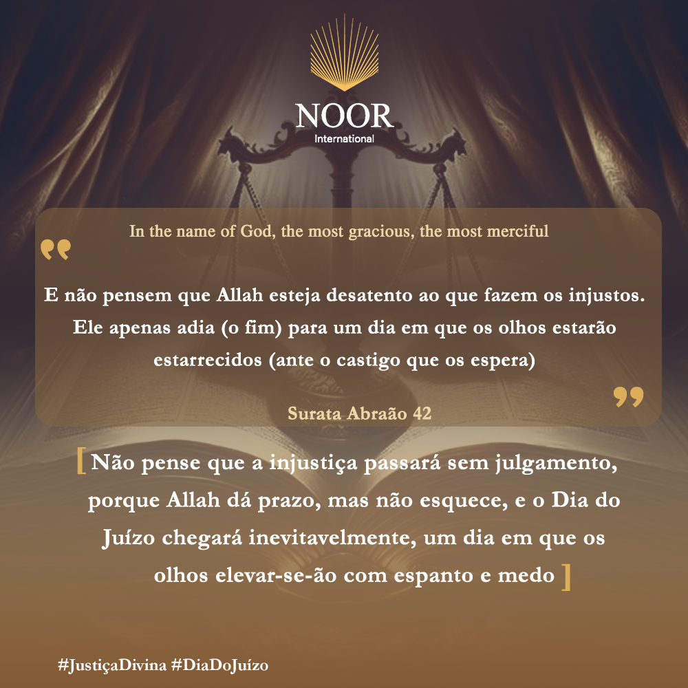 "Não pense que a injustiça passará sem julgamento, porque Allah dá prazo, mas não esquece, e o Dia do Juízo chegará inevitavelmente, um dia em que os olhos se elevarão com espanto e medo." #JustiçaDivina #DiaDoJuízo