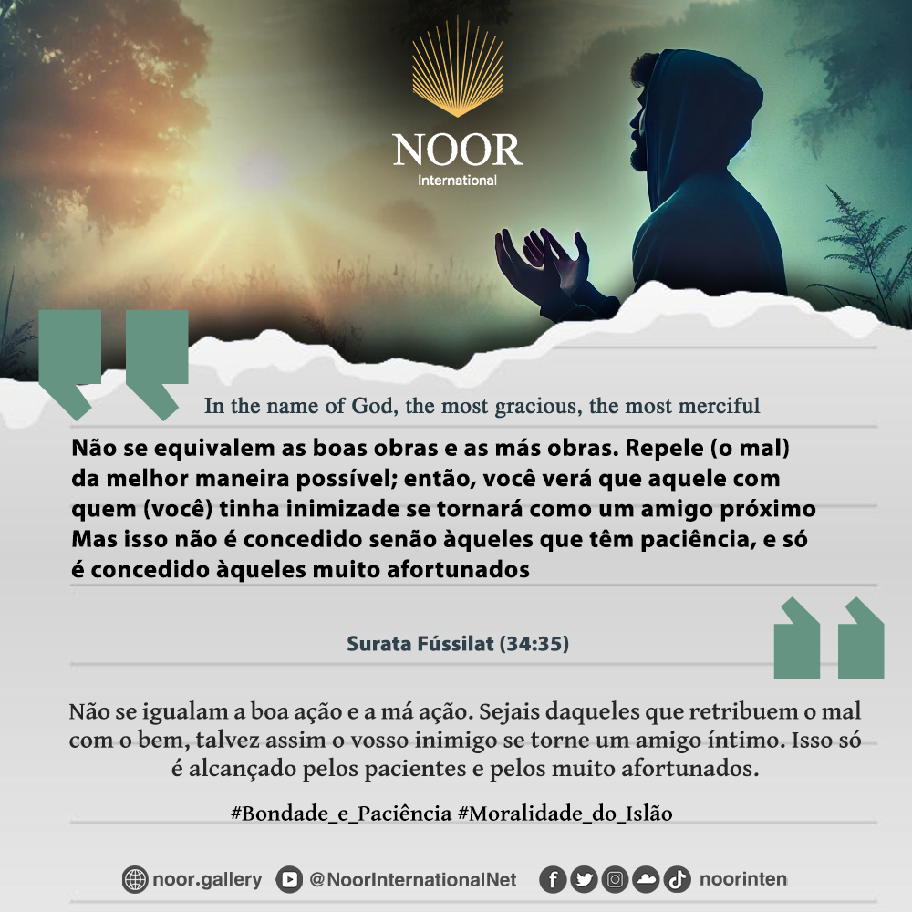 Não se igualam a boa ação e a má ação. Seja daqueles que retribuem o mal com o bem, talvez assim o seu inimigo se torne um amigo íntimo. Isso só é alcançado pelos pacientes e pelos muito afortunados." #Bondade_e_Paciência #Moralidade_do_Islã