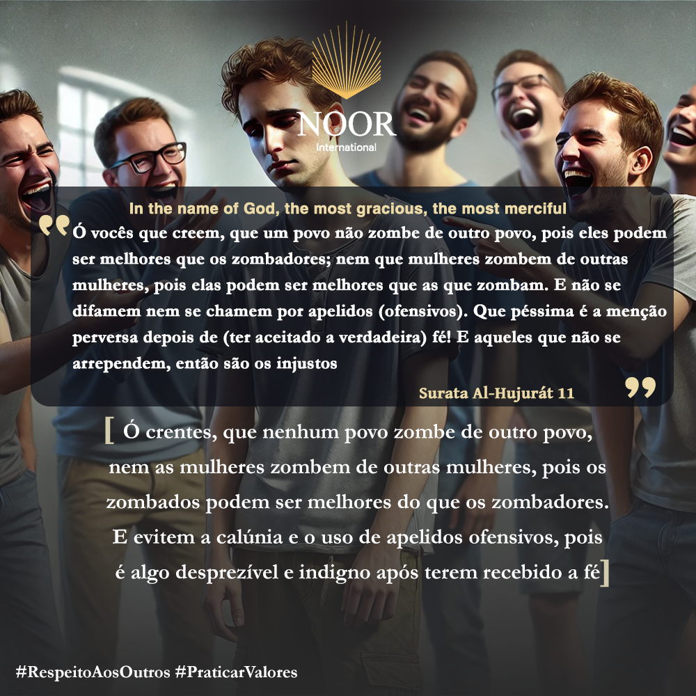 “Ó crentes, que nenhum povo zombe de outro povo, nem as mulheres zombem de outras mulheres, pois os zombados podem ser melhores do que os zombadores. E evitem a calúnia e o uso de apelidos ofensivos, pois é algo desprezível e indigno após terem recebido a fé.” #RespeitoAosOutros #PraticarValores