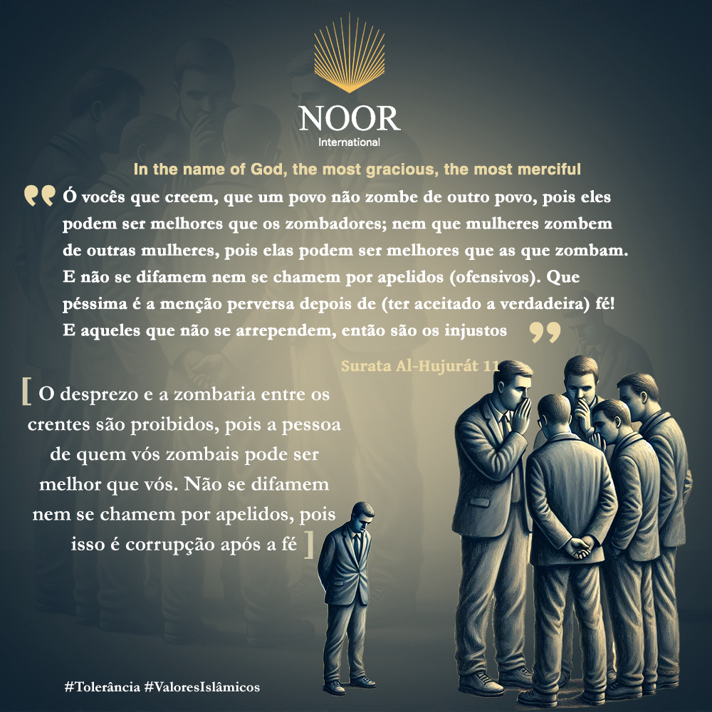 "O desprezo e a zombaria entre os crentes são proibidos, pois a pessoa de quem você zomba pode ser melhor que você. Não se difamem nem se chamem por apelidos, pois isso é corrupção após a fé." #Tolerância #ValoresIslâmicos