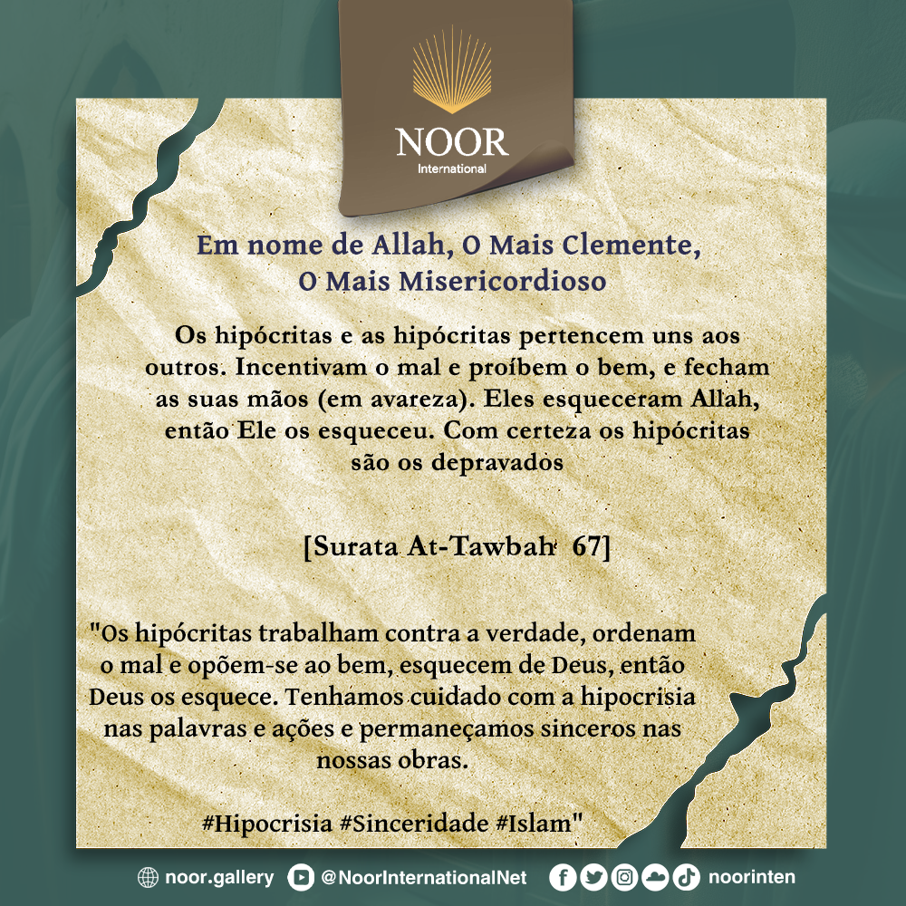 Os hipócritas trabalham contra a verdade, ordenam o mal e opõem-se ao bem, esquecem de Deus, então Deus os esquece. Tenhamos cuidado com a hipocrisia nas palavras e ações e permaneçamos sinceros nas nossas obras. |
