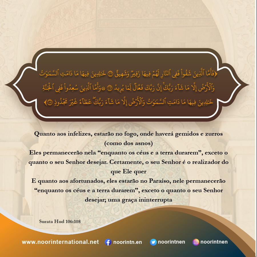 E quanto aos afortunados, eles estarão no Paraíso, nele permanecerão “enquanto os céus e a terra durarem”, exceto o quanto o seu Senhor desejar; uma graça ininterrupta