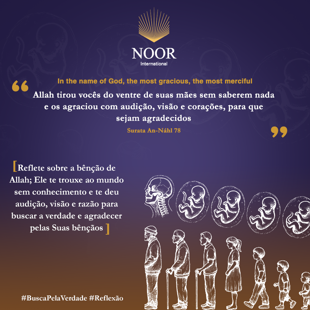 Reflete sobre a bênção de Allah; Ele te trouxe ao mundo sem conhecimento e te deu audição, visão e razão para buscar a verdade e agradecer por Suas bênçãos." #BuscaPelaVerdade #Reflexão