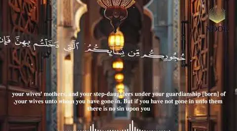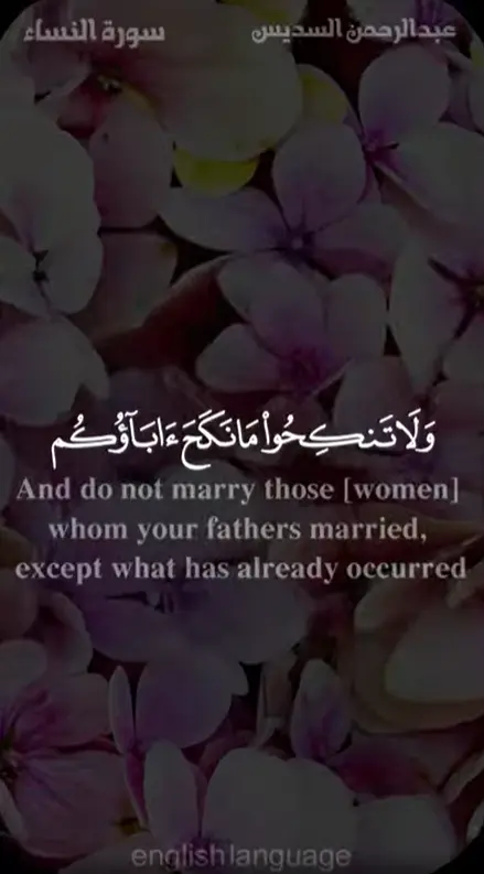22. “And do not marry those [women] whom your fathers married, except what has already occurred. Indeed, it was an immorality and hateful [to Allah] and was evil as a way. 23. “Prohibited to you [for marriage] are your mothers, your daughters, your sisters, your father’s sisters, your mother’s sisters, your brother’s daughters, your sister’s daughters, your [milk] mothers who nursed you, your sisters through nursing, your wives’ mothers, and your step-daughters under your guardianship [born] of your wives unto whom you have gone in. But if you have not gone in unto them, there is no sin upon you. And [also prohibited are] the wives of your sons who are from your [own] loins, and that you take [in marriage] two sisters simultaneously, except for what has already occurred. Indeed, Allah is ever Forgiving and Merciful.” [An-Nisa: 22-23]