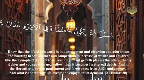 “Know that the life of this world is but amusement and diversion and adornment and boasting to one another and competition in increase of wealth and children – like the example of a rain whose [resulting] plant growth pleases the tillers; then it dries and you see it turned yellow; then it becomes [scattered] debris. And in the Hereafter is severe punishment and forgiveness from Allah and approval. And what is the worldly life except the enjoyment of delusion.” [Al-Hadid: 20]