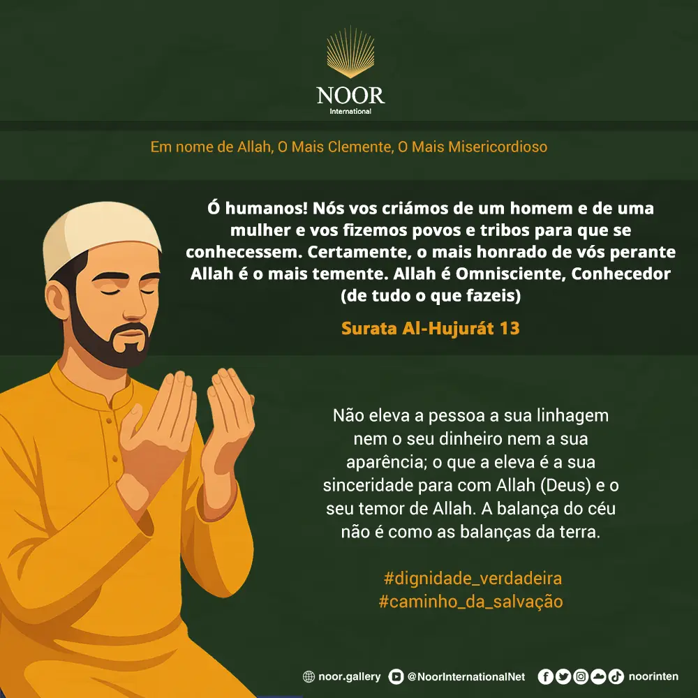Ó humanos! Nós vos criámos de um homem e de uma mulher e vos fizemos povos e tribos para que se conhecessem. Certamente, o mais honrado de vós perante Allah é o mais temente. Allah é Omnisciente, Conhecedor (de tudo o que fazeis)
