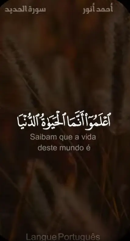 Saibam que a vida deste mundo é apenas um jogo, uma diversão, um adorno, um motivo de vanglória entre vós e um acúmulo de riqueza e descendência. É como a chuva cujas plantas agradam aos agricultores, depois elas secam e ele vê-as amarelas; depois, tornam-se palha. E na próxima (vida) há um severo castigo e também perdão de Allah e a Sua satisfação. E a vida deste mundo não é senão um prazer enganoso