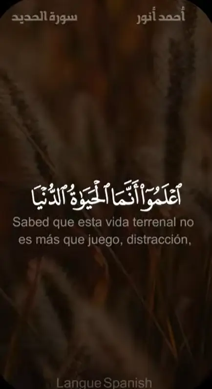 Sabed que esta vida terrenal no es más que juego, distracción, encanto, presunción y rivalidad entre vosotros por la cantidad de riquezas y de hijos que tenéis. Es como una lluvia que hace que las plantas crezcan causando la admiración de los sembradores, mas luego estasse secan tornándose ocres hasta que quedan desmenuzadas en pequeños fragmentos[1]. Y en la otra vida habrá un severo castigo (para quienes hayan vivido indiferentes a la verdad) y el perdón de Al-lah y Su complacencia (para quienes Lo hayan obedecido). Y esta vida no es más que un disfrute engañoso.
