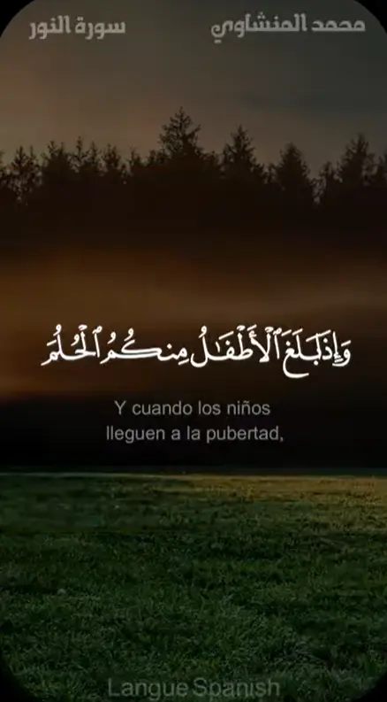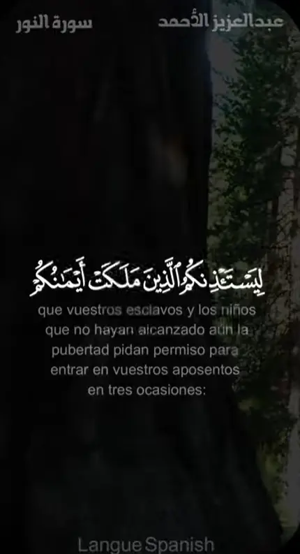 ¡Oh, creyentes!, que vuestros esclavos y los niños que no hayan alcanzado aún la pubertad pidan permiso para entrar en vuestros aposentos en tres ocasiones: antes del rezo del alba, cuando os desvestís para descansaral mediodía y después del rezo de la noche. Son tres momentos de privacidad para vosotros. Si entran en vuestros aposentos sin pedir permiso enotros momentos del día, no incurren en falta ni tampoco vosotros, pues son momentos en los que os reunís y atendéis vuestros asuntos. Así es como Al-lah os explica Sus mandatos. Y Al-lah es Omnisciente y Sabio.