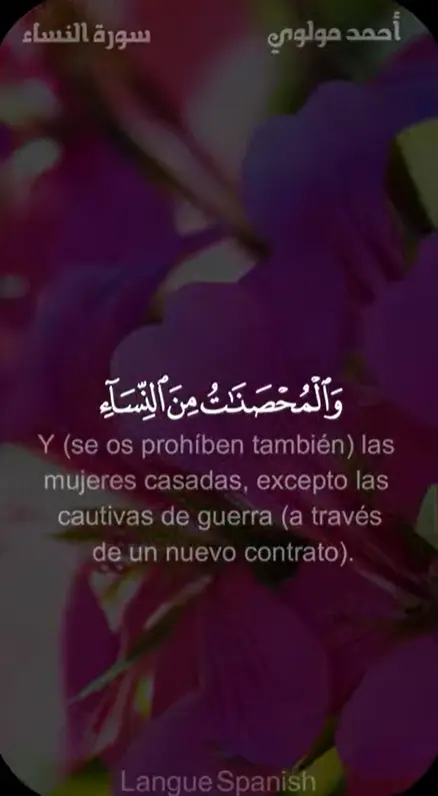 Y (se os prohíben también) las mujeres casadas, excepto las cautivas de guerra[1] (a través de un nuevo contrato). Esto es un mandato de Al-lah. Se os permiten el resto de las mujeres si les entregáis unos bienes como maher con la intención de casaros con ellas, no para mantener con ellas relaciones ilícitas. Y ya que vais a gozar de ellas (en matrimonio) entregadles el maher que os ha sido ordenado (por Al-lah). No cometéis ninguna falta si ambos acordáis una cantidad distinta después de la estipulada (ya sea esta mayor o bien ella renuncie a una parte). En verdad, Al-lah es Omnisciente y Sabio.