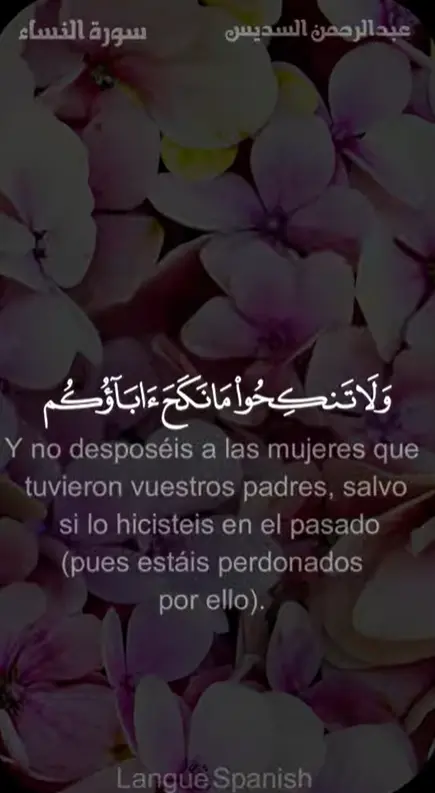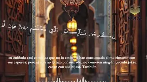 Se os prohíben (en matrimonio): vuestras madres, vuestras hijas, vuestras hermanas, vuestras tías paternas y maternas, vuestras sobrinas por parte de hermano o hermana, vuestras madres y hermanas de leche, las madres de vuestras esposas y las hijas de vuestras esposas que estén bajo vuestro cuidado (así como las que no lo estén) si habéis consumado el matrimonio con vuestras esposas; pero, si aún no lo habéis consumado, no cometéis ningún pecado (si os casáis con sus hijas). También (os están prohibidas en matrimonio) las esposas de vuestros hijos biológicos[1] y casaros con dos hermanas a la vez, salvo si lo hicisteis en el pasado (en la época previa al islam). Ciertamente, Al-lah es Indulgente y Misericordioso.
