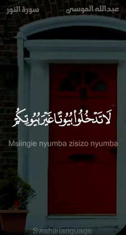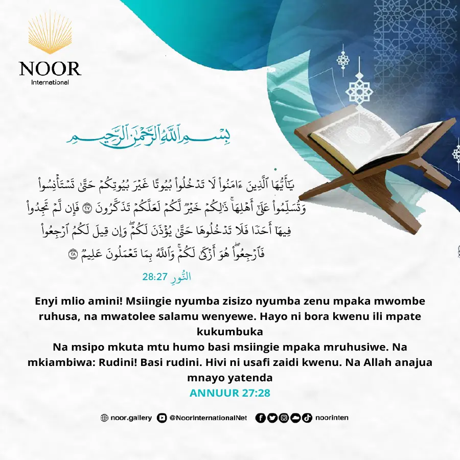 Enyi mlio amini! Msiingie nyumba zisizo nyumba zenu mpaka mwombe ruhusa, na mwatolee salamu wenyewe. Hayo ni bora kwenu ili mpate kukumbuka
