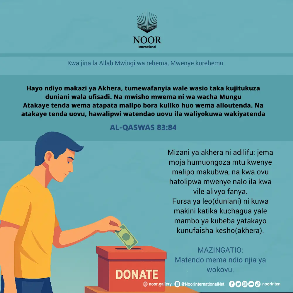 Mizani ya akhera ni adilifu: jema moja humuongoza mtu kwenye malipo makubwa, na kwa ovu hatolipwa mwenye nalo ila kwa vile alivyo fanya.