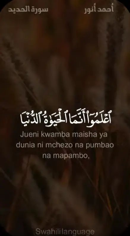 Jueni kwamba maisha ya dunia ni mchezo na pumbao na mapambo, na kufakharishana baina yenu na kushindana kwa wingi wa mali na watoto; ni kama mfano wa mvua inayowafurahisha wakulima mimea yake, kisha yananyweya, kisha utayaona yamepiga manjano, kisha yanakuwa mabua. Na Akhera kuna adhabu kali, na msamaha kutoka kwa Allah na radhi zake. Na uhai wa dunia si chochote isipokuwa ni sterehe fupi za udanganyifu