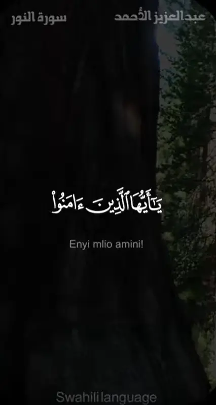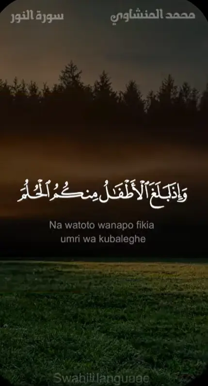 Enyi mlio amini! Nawakutakeni idhini iliyo wamiliki mikono yenu ya kulia na walio bado kubaleghe miongoni mwenu mara tatu - kabla ya Sala ya alfajiri, na wakati mnapo vua nguo zenu adhuhuri, na baada ya Sala ya ishaa. Hizi ni nyakati tatu za faragha kwenu. Si vibaya kwenu wala kwao baada ya nyakati hizi, kuzungukiana nyinyi kwa nyinyi. Hivyo ndivyo Allah anavyo kuelezeni Aya zake, na Allah ni Mjuzi Mwenye hekima
