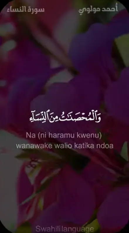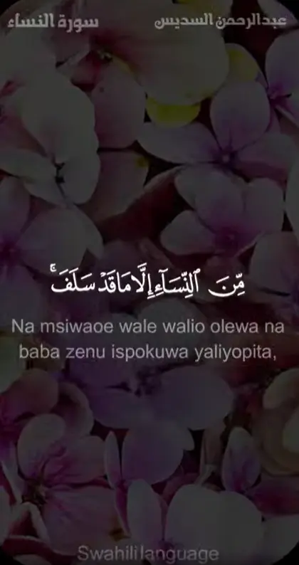 Wameharamishwa kwenu mama zenu, na binti zenu na dada zenu na shangazi zenu, na ndugu wa mama zenu na watoto wa kaka zenu, na watoto wa dada zenu, na mama zenu ambao wamewanyonyesha na dada zenu wa kunyonya, na mama wa wake zenu, na watoto wa wake zenu ambao wapo majumbani mwenu wanaotokana na wake mlio waingilia, kama (wake hao) hamjawaingilia, basi sivibaya kwenu[1]. Na (ni haramu kwenu) wake wa watoto wenu wa kuwazaa na (ni haramu) kuwakusanya mtu na dada yake ispokua yale yaliyopita, hakika Allah ni mwenye kusamehe mpole mno