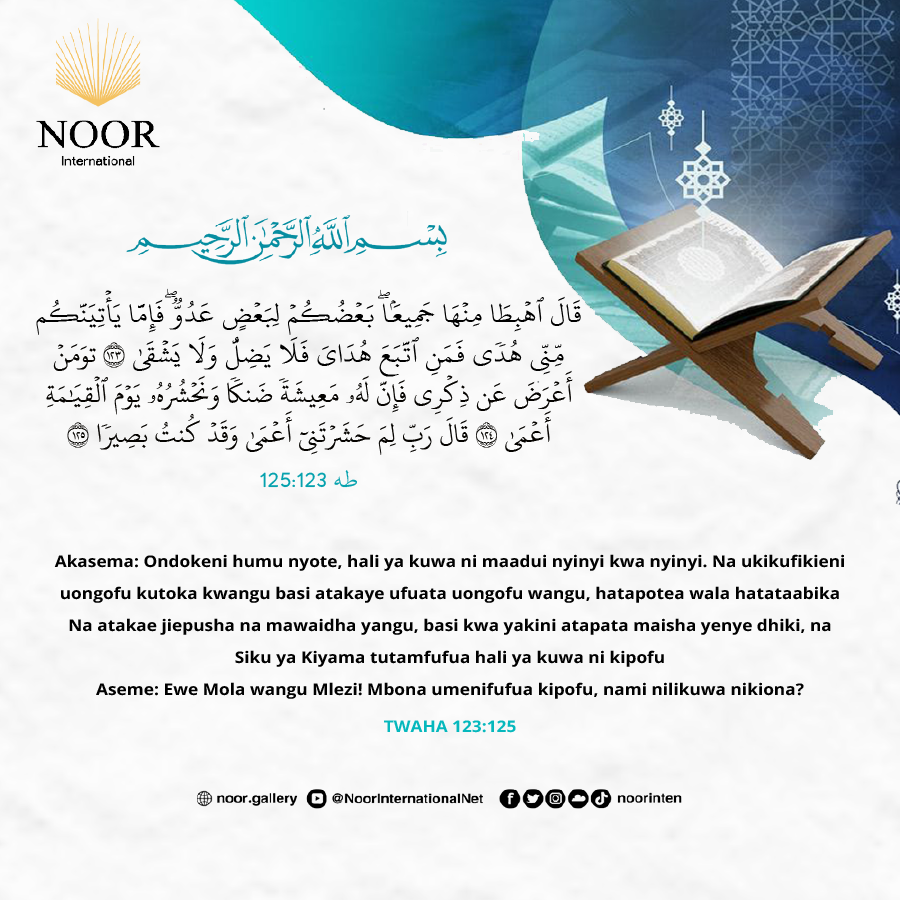 Na atakae jiepusha na mawaidha yangu, basi kwa yakini atapata maisha yenye dhiki, na Siku ya Kiyama tutamfufua hali ya kuwa ni kipofu
