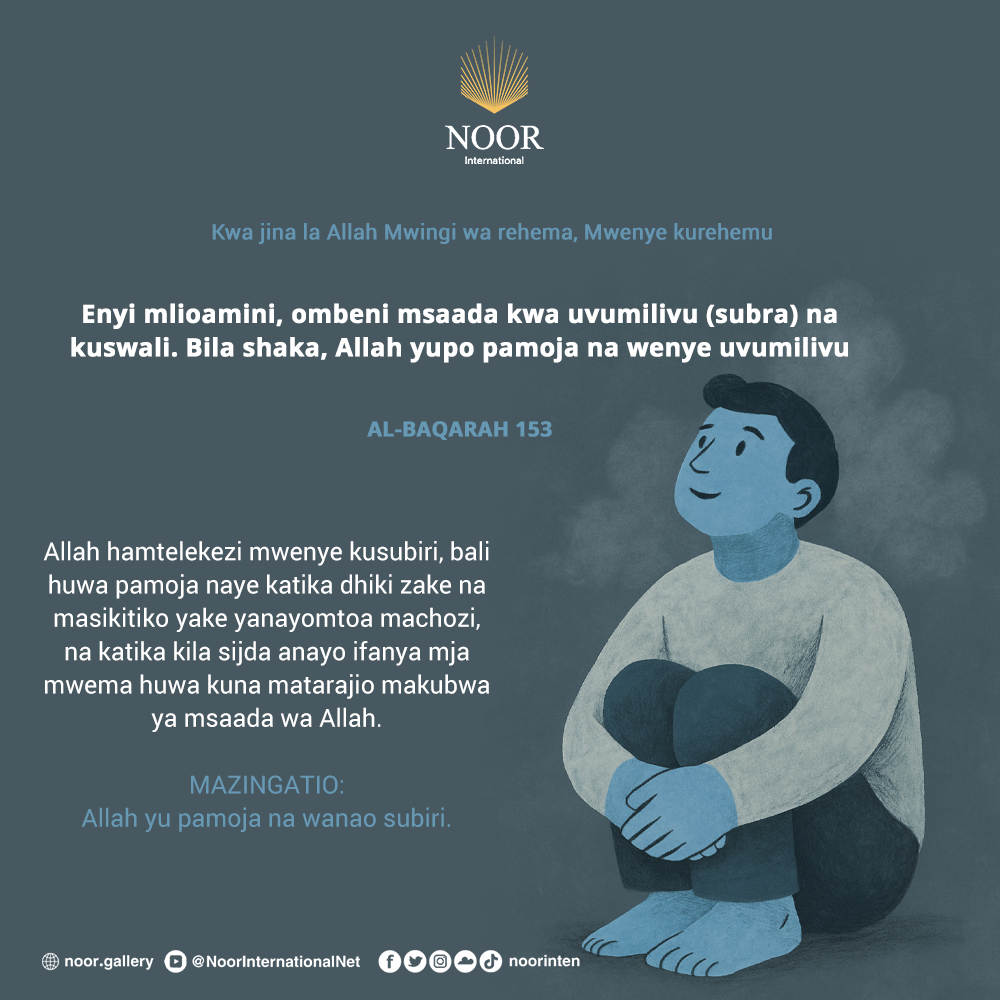 Allah hamtelekezi mwenye kusubiri, bali huwa pamoja naye katika dhiki zake na masikitiko yake yanayomtoa machozi, na katika kila sijda anayo ifanya mja mwema huwa kuna matarajio makubwa ya msaada wa Allah.