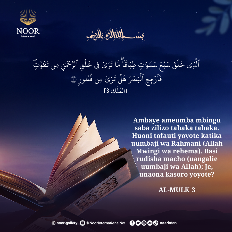 Ambaye ameumba mbingu saba zilizo tabaka tabaka. Huoni tofauti yoyote katika uumbaji wa Rahmani (Allah Mwingi wa rehema). Basi rudisha macho (uangalie uumbaji wa Allah); Je, unaona kasoro yoyote?
