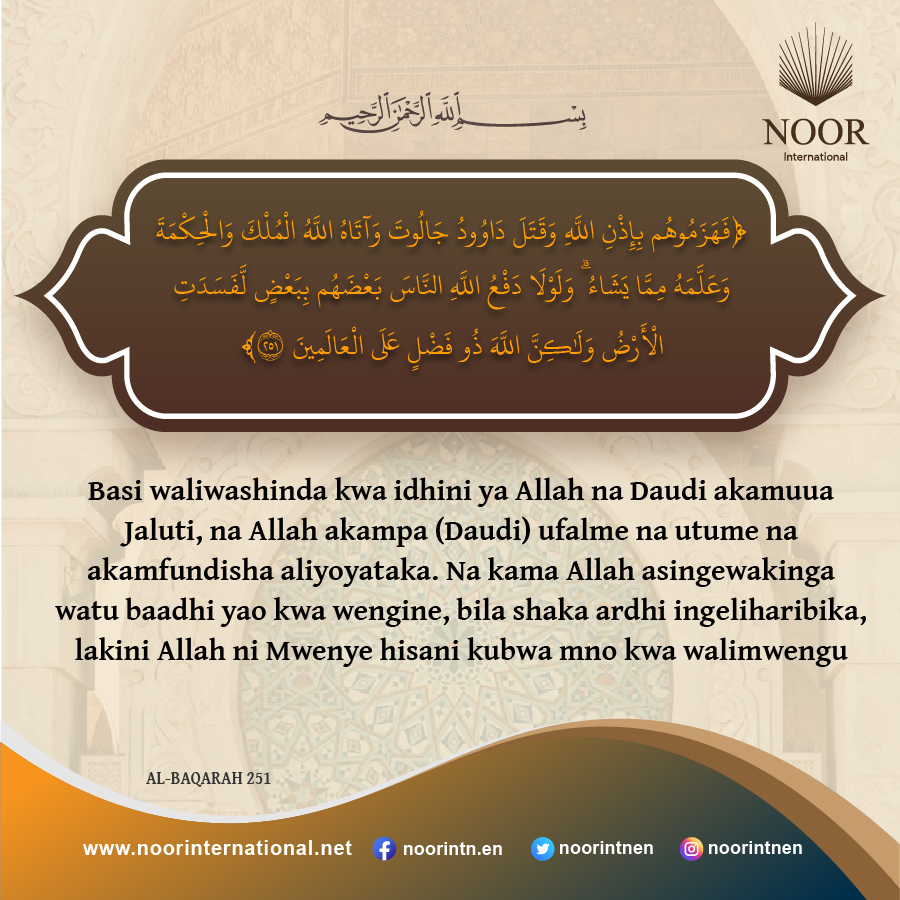 Basi waliwashinda kwa idhini ya Allah na Daudi akamuua Jaluti, na Allah akampa (Daudi) ufalme na utume na akamfundisha aliyoyataka.