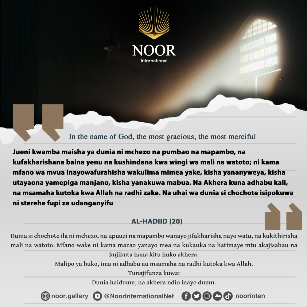 Dunia si chochote ila ni mchezo, na upuuzi na mapambo wanayo jifakharisha nayo watu, na kukithirisha mali na watoto. Mfano wake ni kama mazao yanayo mea na kukauka na hatimaye mtu akajisahau na kujikuta hana kitu huko akhera.