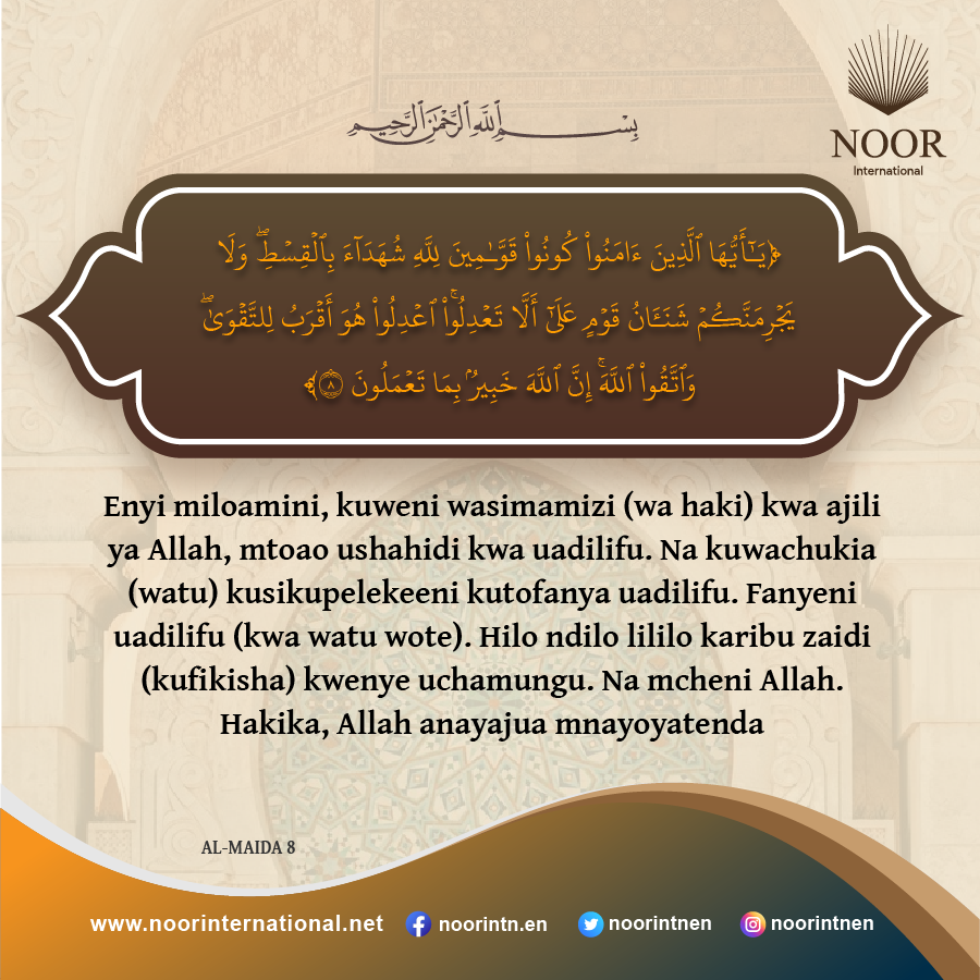 Enyi miloamini, kuweni wasimamizi (wa haki) kwa ajili ya Allah, mtoao ushahidi kwa uadilifu. Na kuwachukia (watu) kusikupelekeeni kutofanya uadilifu. Fanyeni uadilifu (kwa watu wote). Hilo ndilo lililo karibu zaidi (kufikisha) kwenye uchamungu. Na mcheni Allah. Hakika, Allah anayajua mnayoyatenda