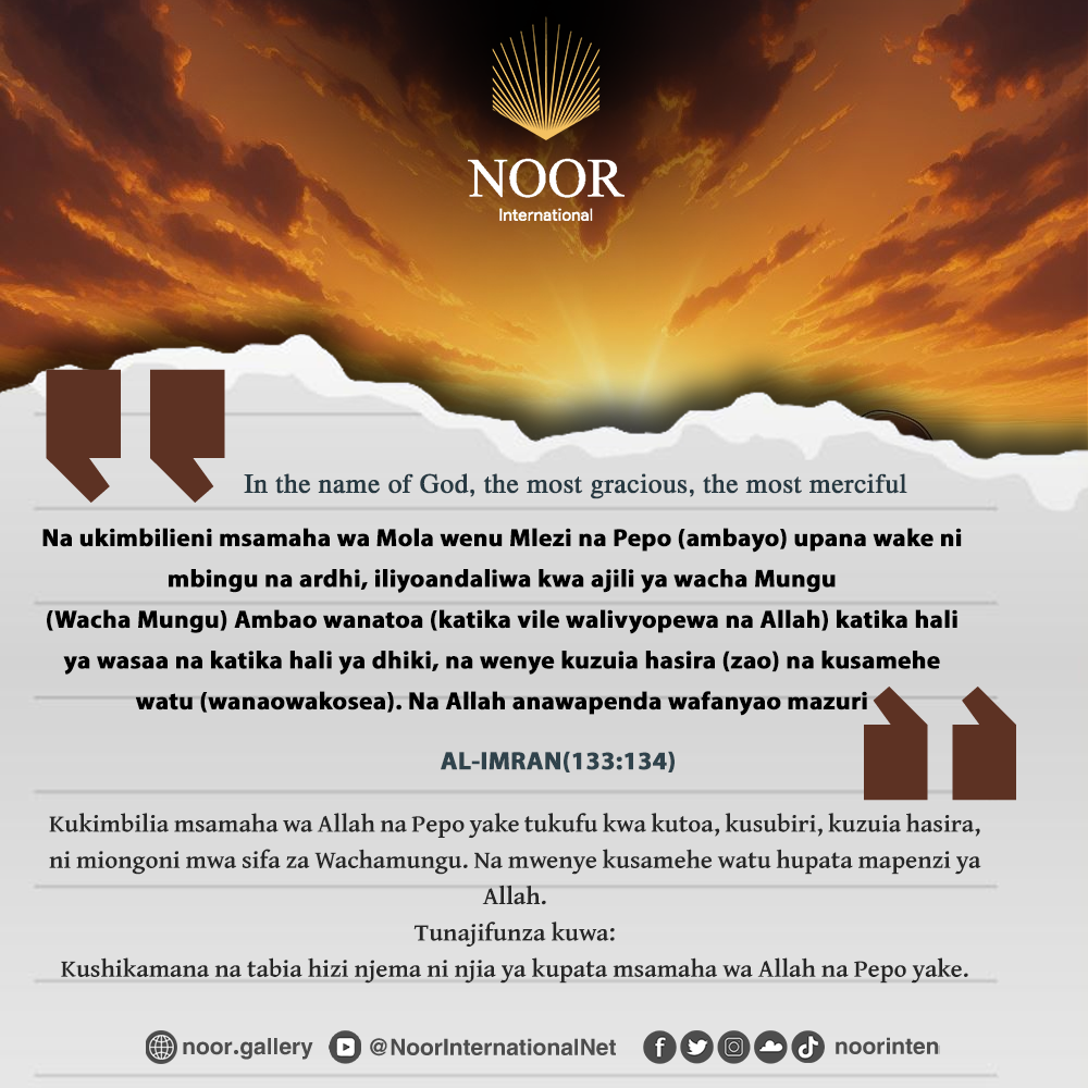 Kukimbilia msamaha wa Allah na Pepo yake tukufu kwa kutoa, kusubiri, kuzuia hasira, ni miongoni mwa sifa za Wachamungu. Na mwenye kusamehe watu hupata mapenzi ya Allah.