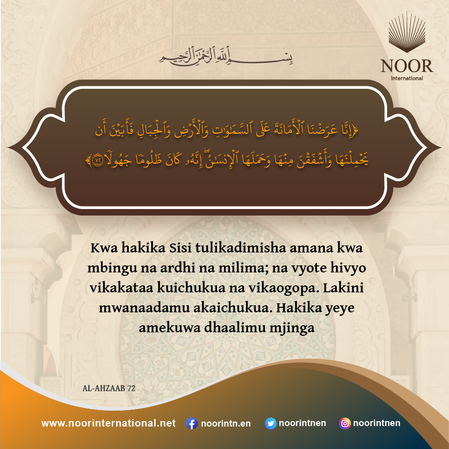 Kwa hakika Sisi tulikadimisha amana kwa mbingu na ardhi na milima; na vyote hivyo vikakataa kuichukua na vikaogopa. Lakini mwanaadamu akaichukua. Hakika yeye amekuwa dhaalimu mjinga