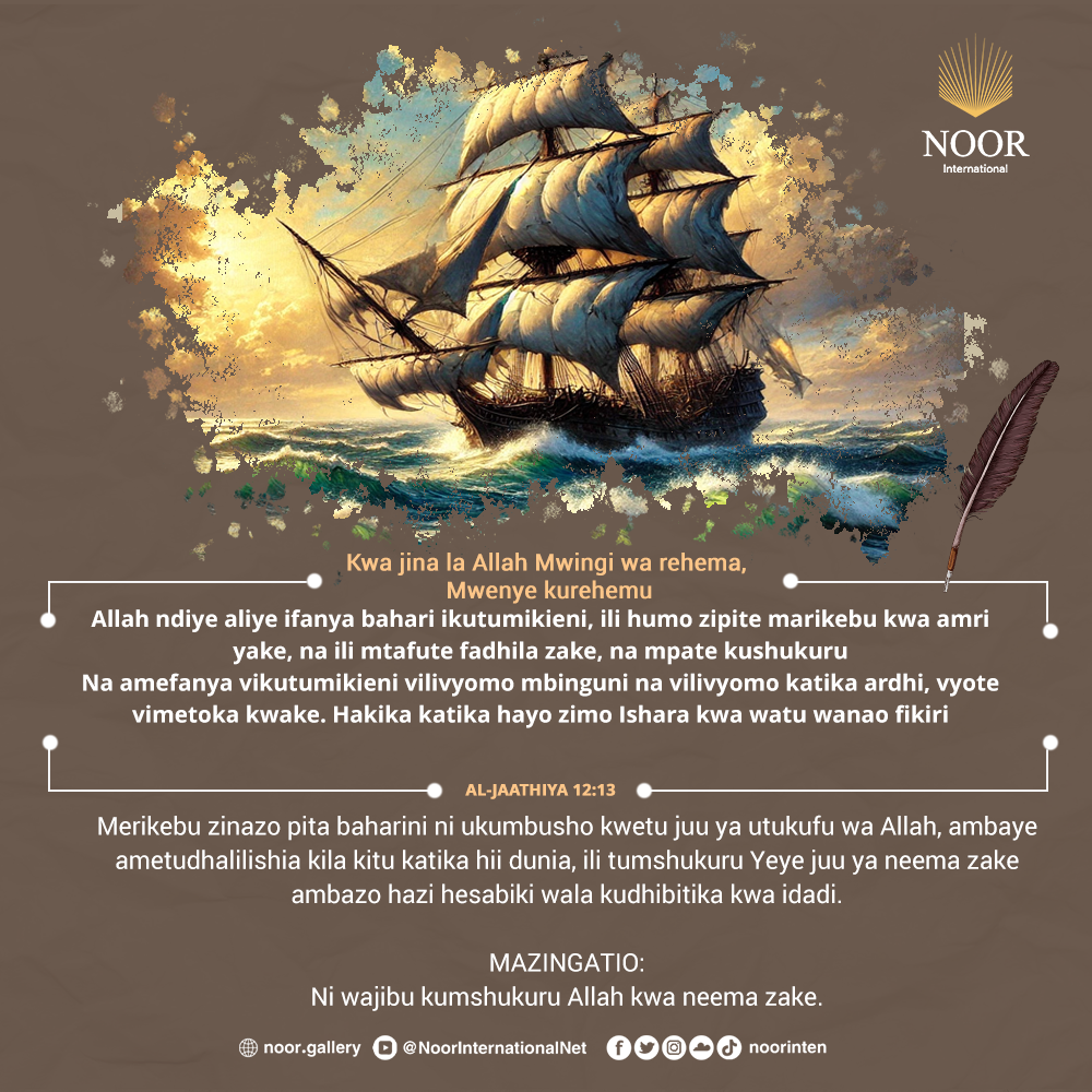 Merikebu zinazo pita baharini ni ukumbusho kwetu juu ya utukufu wa Allah, ambaye ametudhalilishia kila kitu katika hii dunia, ili tumshukuru Yeye juu ya neema zake ambazo hazi hesabiki wala kudhibitika kwa idadi.