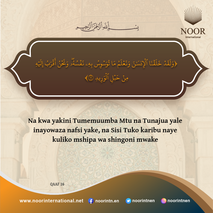 Na kwa yakini Tumemuumba Mtu na Tunajua yale inayowaza nafsi yake, na Sisi Tuko karibu naye kuliko mshipa wa shingoni mwake
