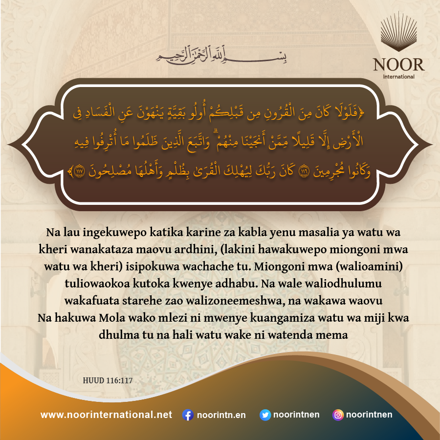 Na lau ingekuwepo katika karine za kabla yenu masalia ya watu wa kheri wanakataza maovu ardhini, (lakini hawakuwepo miongoni mwa watu wa kheri) isipokuwa wachache tu.