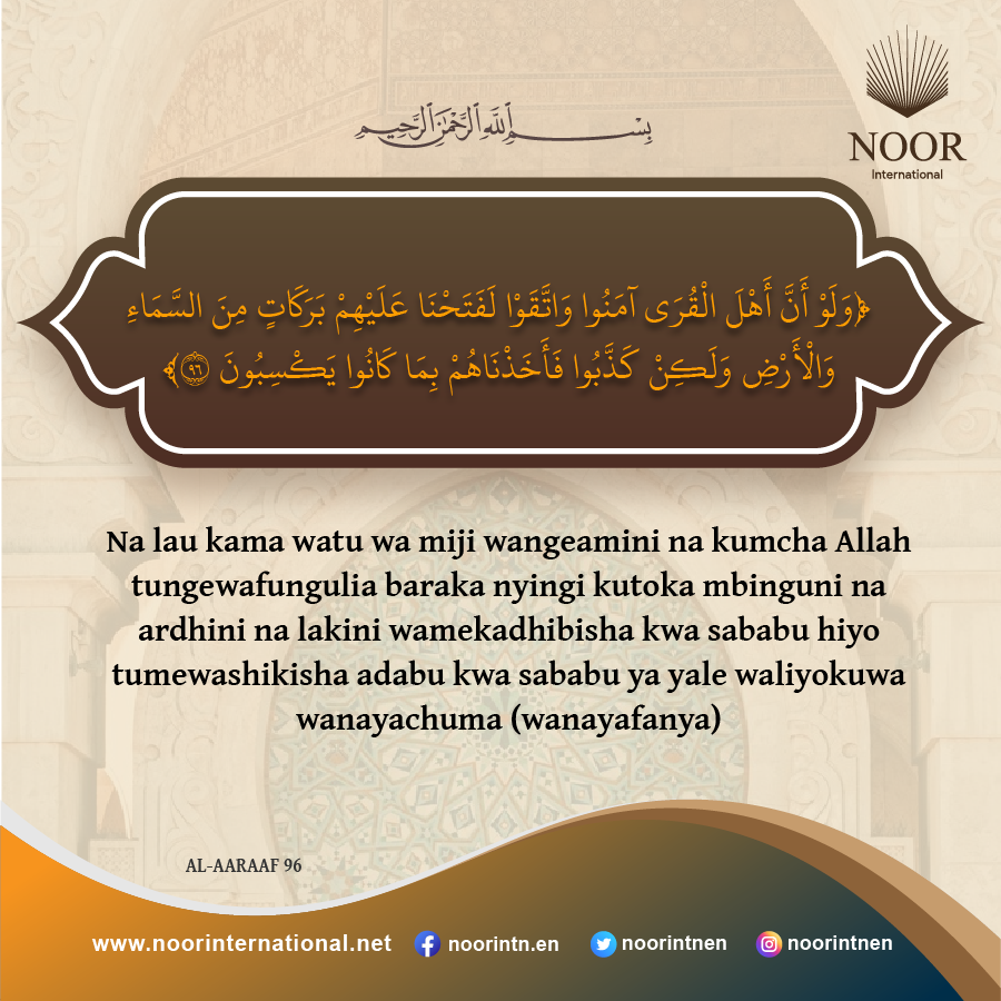 Na lau kama watu wa miji wangeamini na kumcha Allah tungewafungulia baraka nyingi kutoka mbinguni na ardhini na lakini wamekadhibisha kwa sababu hiyo tumewashikisha adabu kwa sababu ya yale waliyokuwa wanayachuma (wanayafanya)
