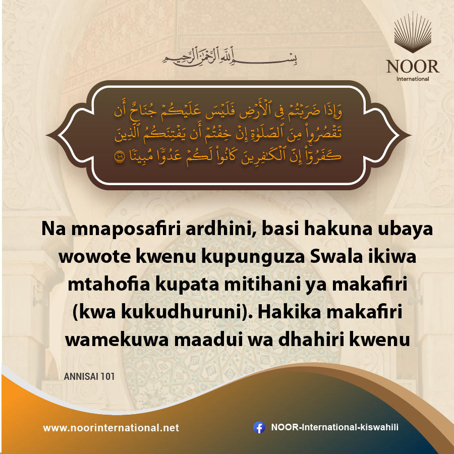 Na mnaposafiri ardhini, basi hakuna ubaya wowote kwenu kupunguza Swala ikiwa mtahofia kupata mitihani ya makafiri (kwa kukudhuruni). Hakika makafiri wamekuwa maadui wa dhahiri kwenu