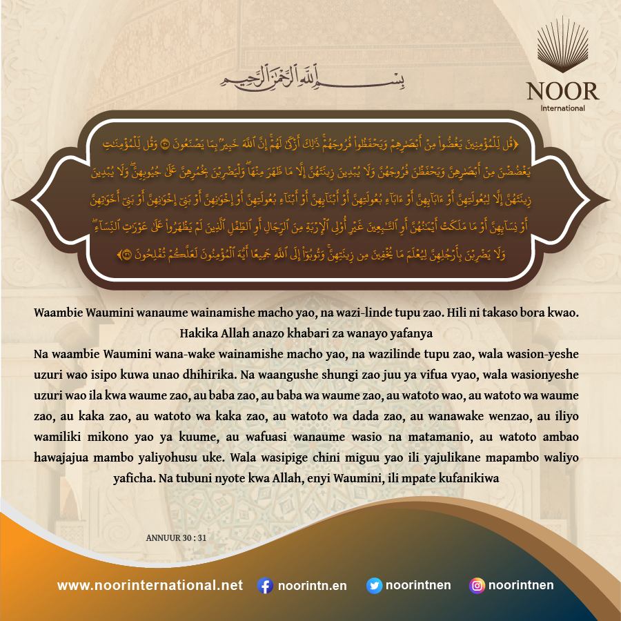 Waambie Waumini wanaume wainamishe macho yao, na wazi-linde tupu zao. Hili ni takaso bora kwao. Hakika Allah anazo khabari za wanayo yafanyaNa waambie Waumini wana-wake wainamishe macho yao, na wazilinde tupu zao, wala wasion-yeshe uzuri wao isipo kuwa unao dhihirika. Na waangushe shungi zao juu ya vifua vyao, wala wasionyeshe uzuri wao ila kwa waume zao, au baba zao, au baba wa waume zao, au watoto wao, au watoto wa waume zao, au kaka zao, au watoto wa kaka zao, au watoto wa dada zao, au wanawake wenzao, au iliyo wamiliki mikono yao ya kuume, au wafuasi wanaume wasio na matamanio, au watoto ambao hawajajua mambo yaliyohusu uke. Wala wasipige chini miguu yao ili yajulikane mapambo waliyo yaficha. Na tubuni nyote kwa Allah, enyi Waumini, ili mpate kufanikiwa