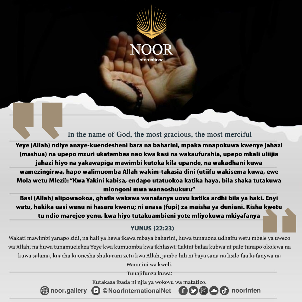 Wakati mawimbi yanapo zidi, na hali ya hewa ikawa mbaya baharini, huwa tunauona udhaifu wetu mbele ya uwezo wa Allah, na huwa tunamuelekea Yeye kwa kumuomba kwa ikhlaswi. Lakini balaa kubwa ni pale tunapo okolewa na kuwa salama, kuacha kuonesha shukurani zetu kwa Allah, jambo hili ni baya sana na lisilo faa kufanywa na Waumini wa kweli.