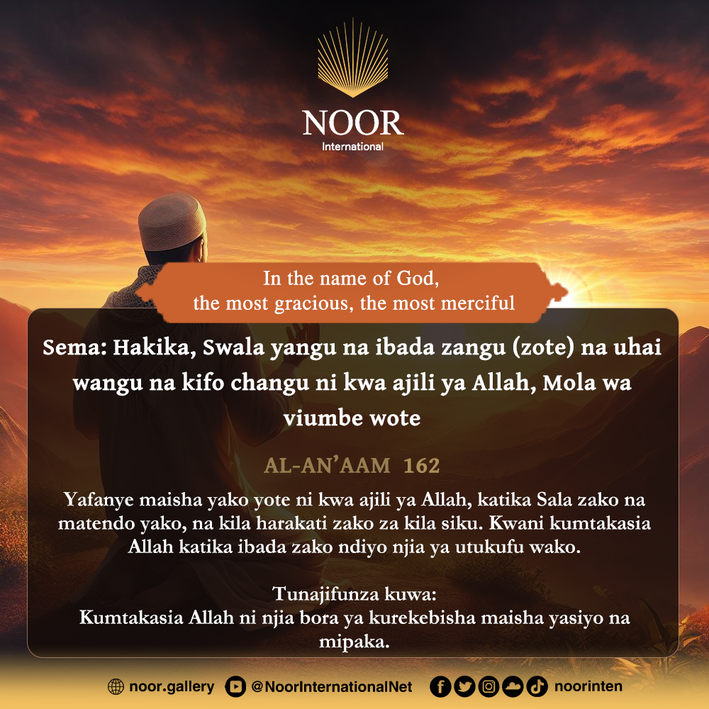 Yafanye maisha yako yote ni kwa ajili ya Allah, katika Sala zako na matendo yako, na kila harakati zako za kila siku. Kwani kumtakasia Allah katika ibada zako ndiyo njia ya utukufu wako.
