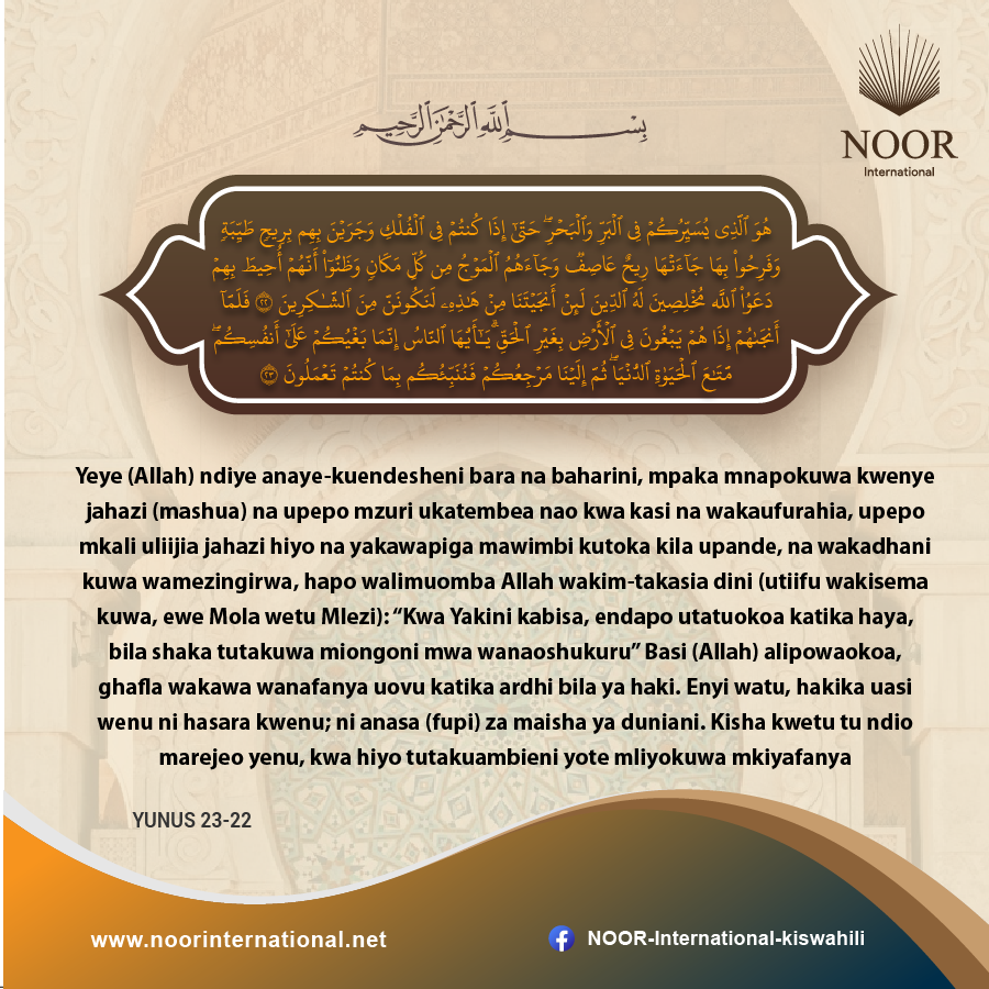 Yeye (Allah) ndiye anaye-kuendesheni bara na baharini, mpaka mnapokuwa kwenye jahazi (mashua) na upepo mzuri ukatembea nao kwa kasi na wakaufurahia, upepo mkali uliijia jahazi hiyo na yakawapiga mawimbi kutoka kila upande, na wakadhani kuwa wamezingirwa, hapo walimuomba Allah wakim-takasia dini (utiifu wakisema kuwa, ewe Mola wetu Mlezi): “Kwa Yakini kabisa, endapo utatuokoa katika haya, bila shaka tutakuwa miongoni mwa wanaoshukuru”