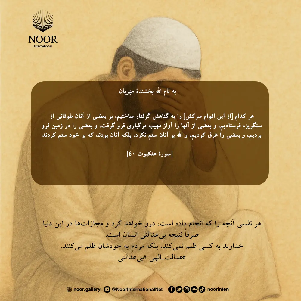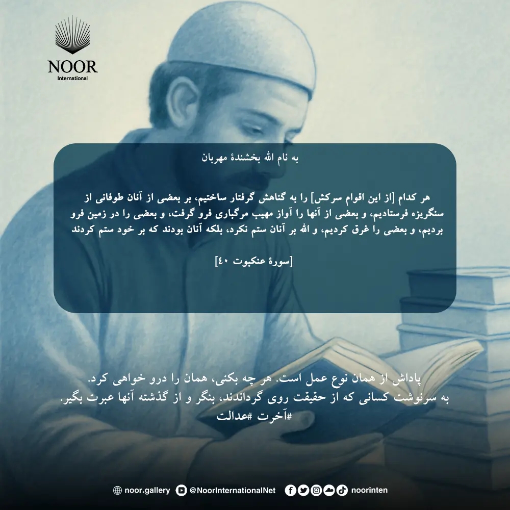 ﴿هر کدام [از اقوام سركش]را به گناهش گرفتار ساختيم، بر بعضى از آنان طوفانی از سنگريزه فرستادیم، و بعضى از آنها را آواز مهيب مرگبارى فرو گرفت، و بعضى از آنها را در زمین فرو برديم، و بعضى از آنها را غرق کردیم، و الله به آنها ستم نکرده، بلکه آنان بودند که بر خود ستم کردند.﴾