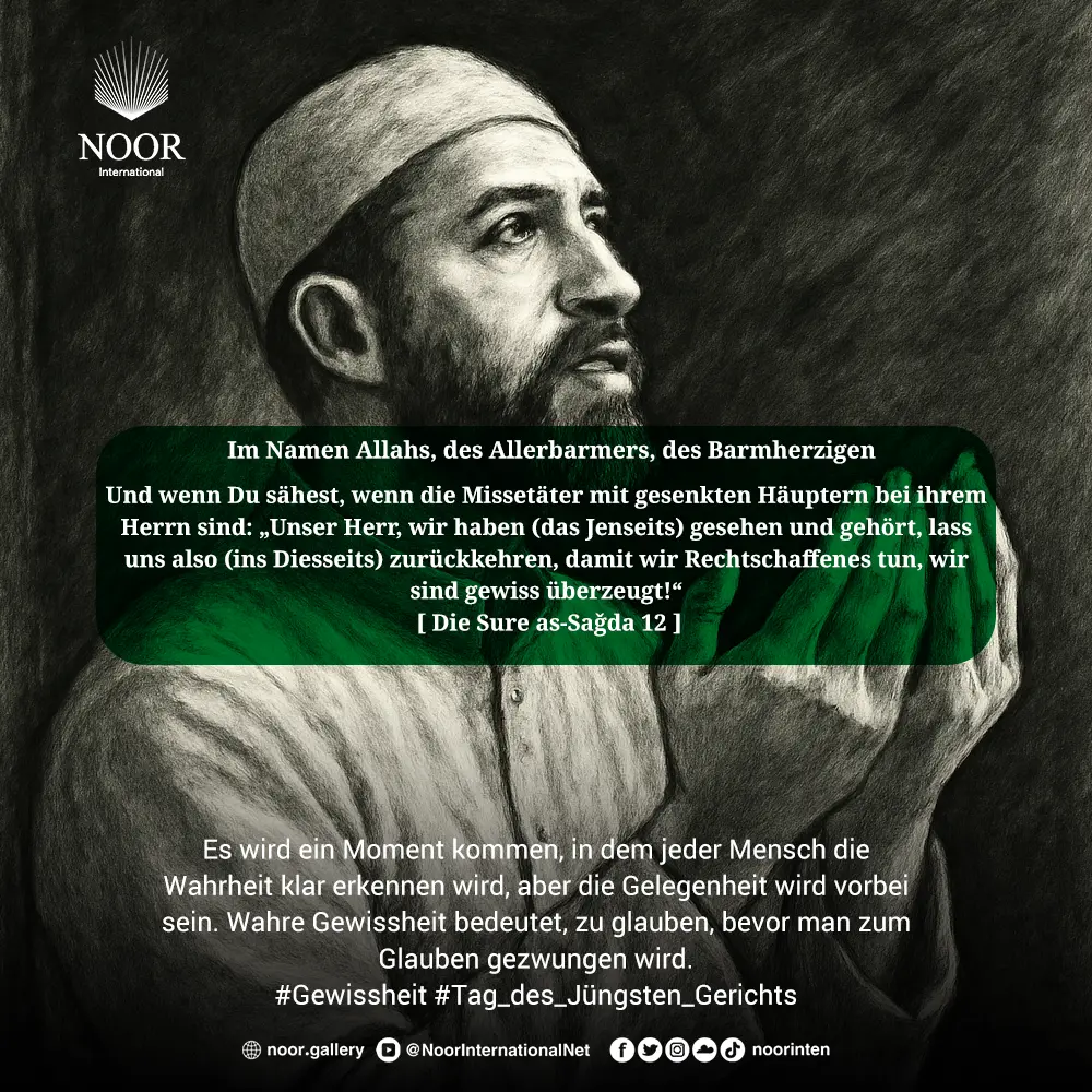 "Und könntest du nur sehen, wenn die Übeltäter vor ihrem Herrn die Köpfe hängen lassen: „Unser Herr, wir haben gesehen und gehört. Bringe uns zurück, so werden wir rechtschaffen handeln. Gewiss, wir sind nun überzeugt.“" (As-Sajda: 12)