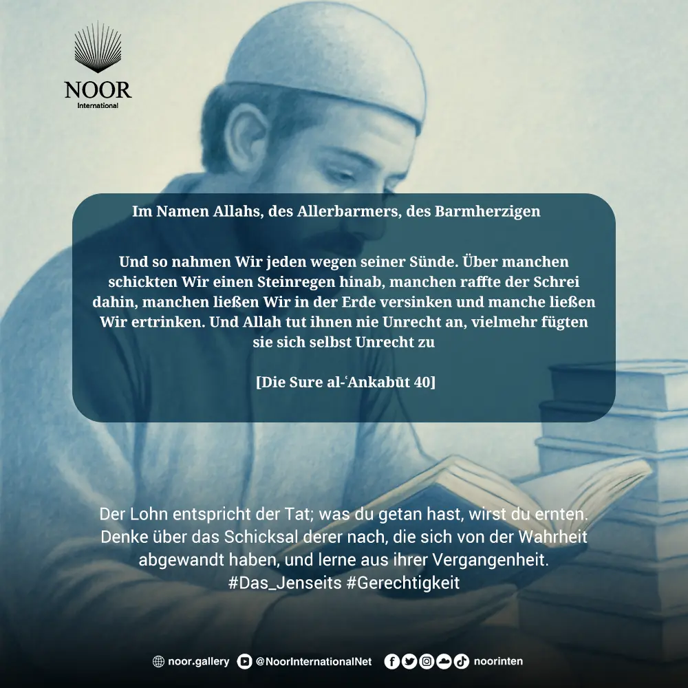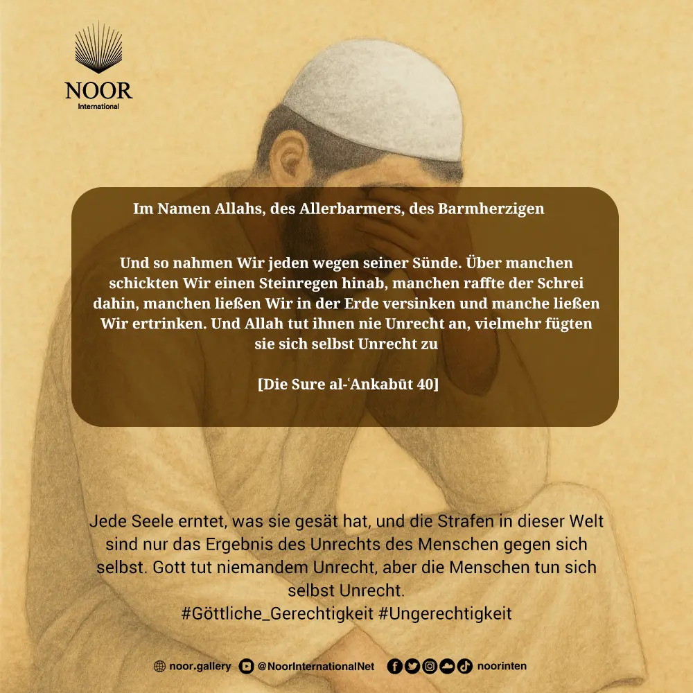 "So erfassten Wir einen jeden von ihnen für seine Sünde. Unter ihnen waren welche, gegen die Wir einen Sandsturm schickten, und welche, die der Schrei erfasste, und welche, mit denen Wir die Erde versinken ließen, und welche, die Wir ertränkten. Und nicht Gott tat ihnen Unrecht, sondern sie taten sich selbst Unrecht." (Al-Ankabut: 40)