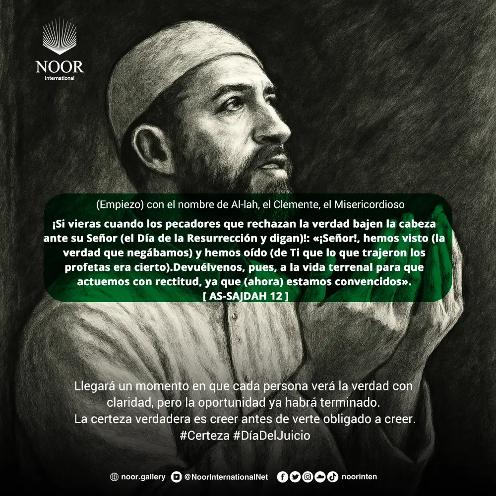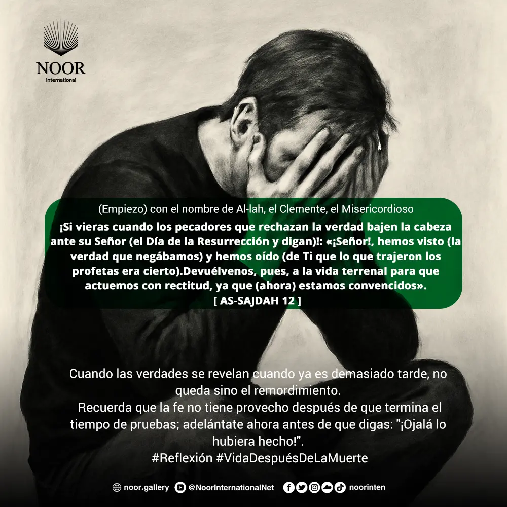 {¡Si vieras cuando los pecadores que rechazan la verdad bajen la cabeza ante su Señor (el Día de la Resurrección y digan)!: «¡Señor!, hemos visto (la verdad que negábamos) y hemos oído (de Ti que lo que trajeron los profetas era cierto).Devuélvenos, pues, a la vida terrenal para que actuemos con rectitud, ya que (ahora) estamos convencidos»} [Corán 32:12]